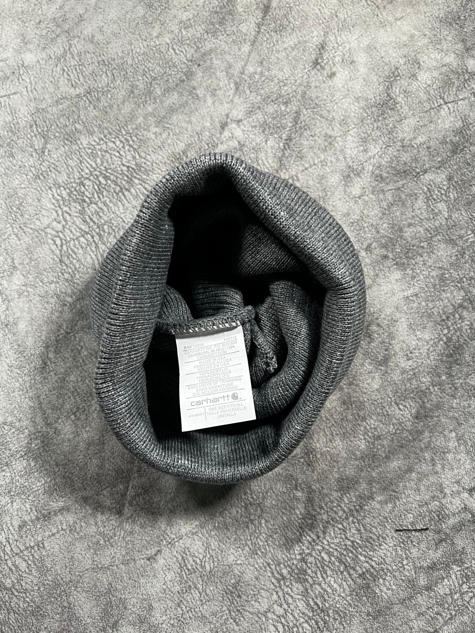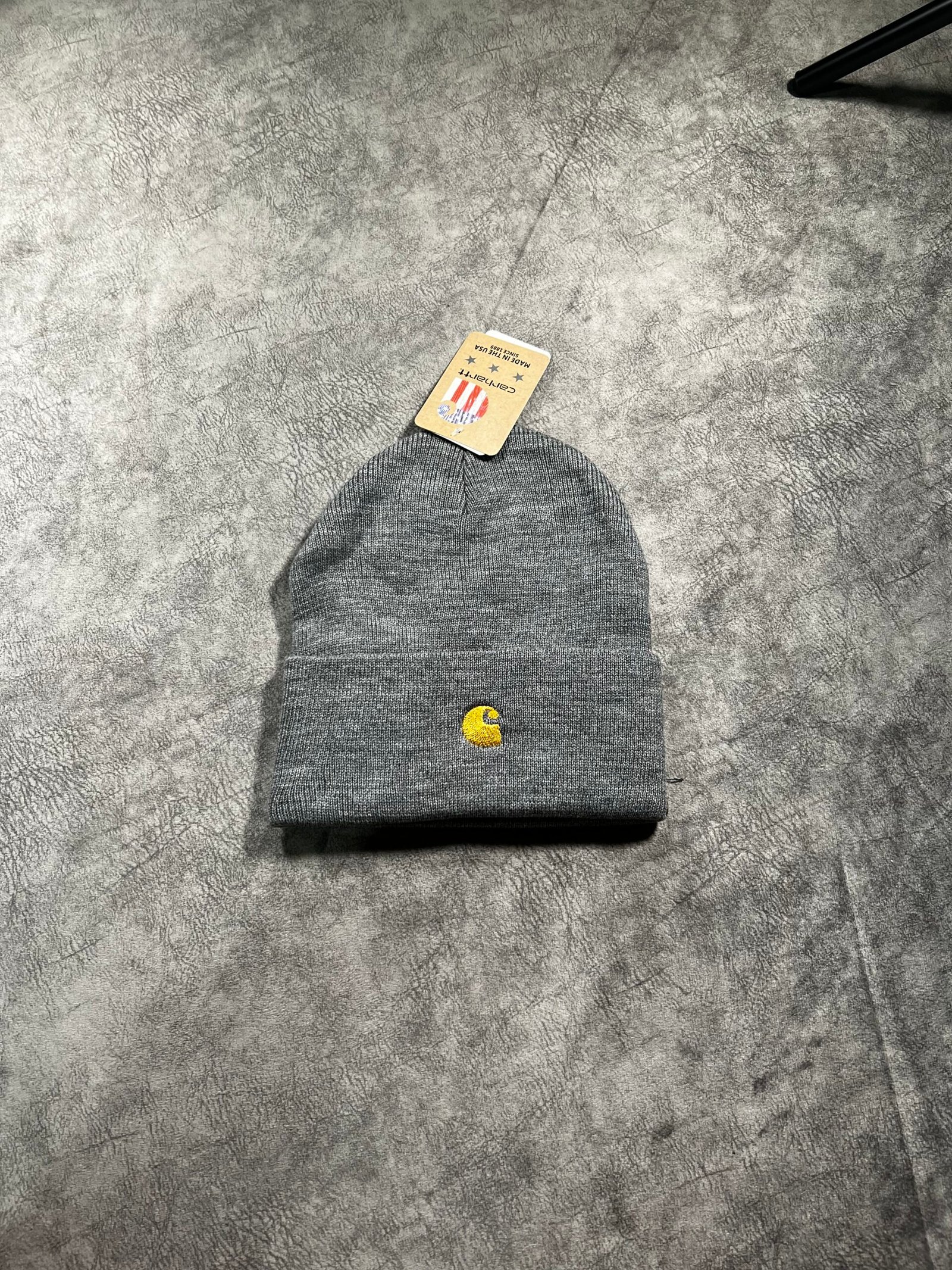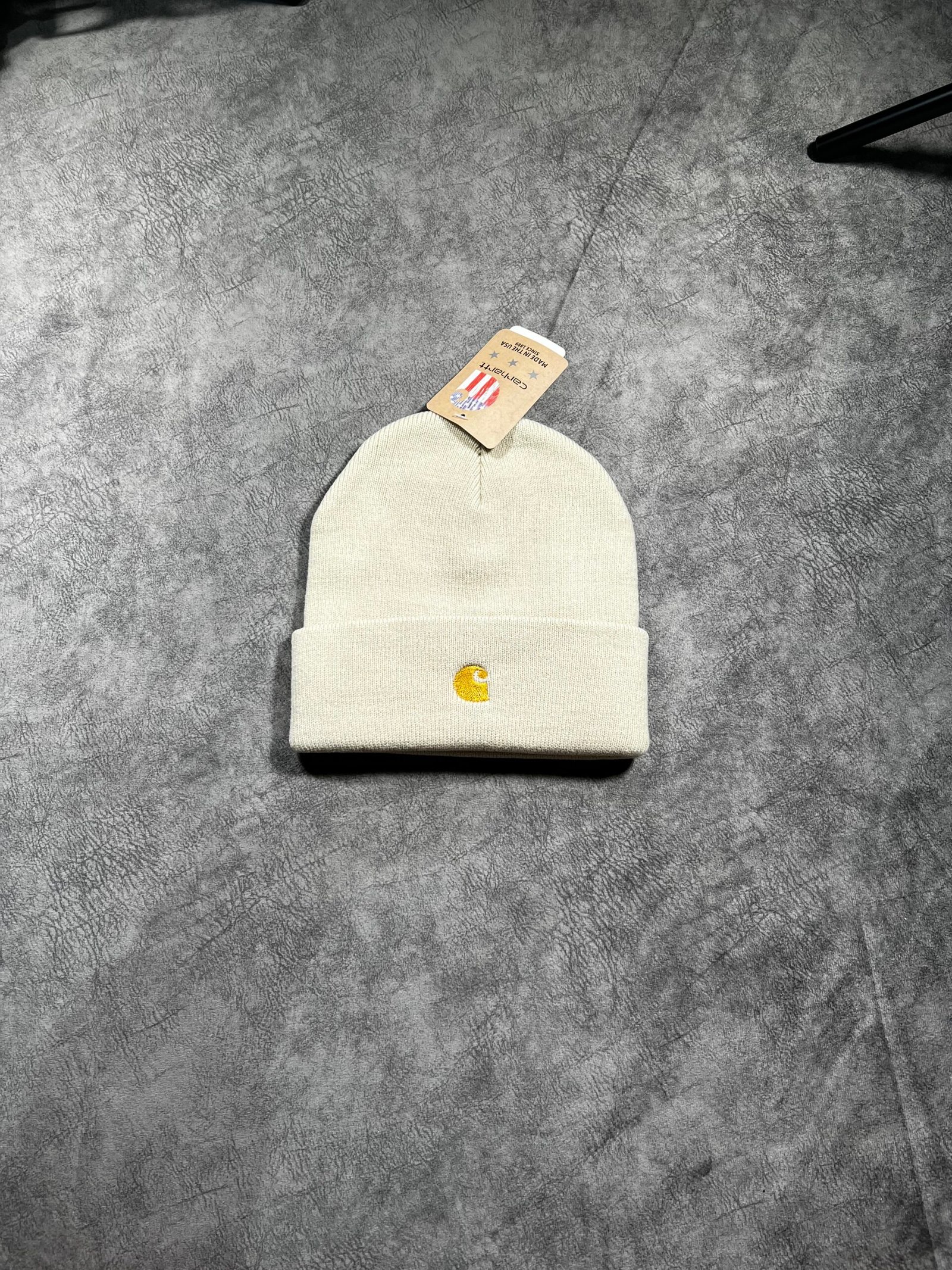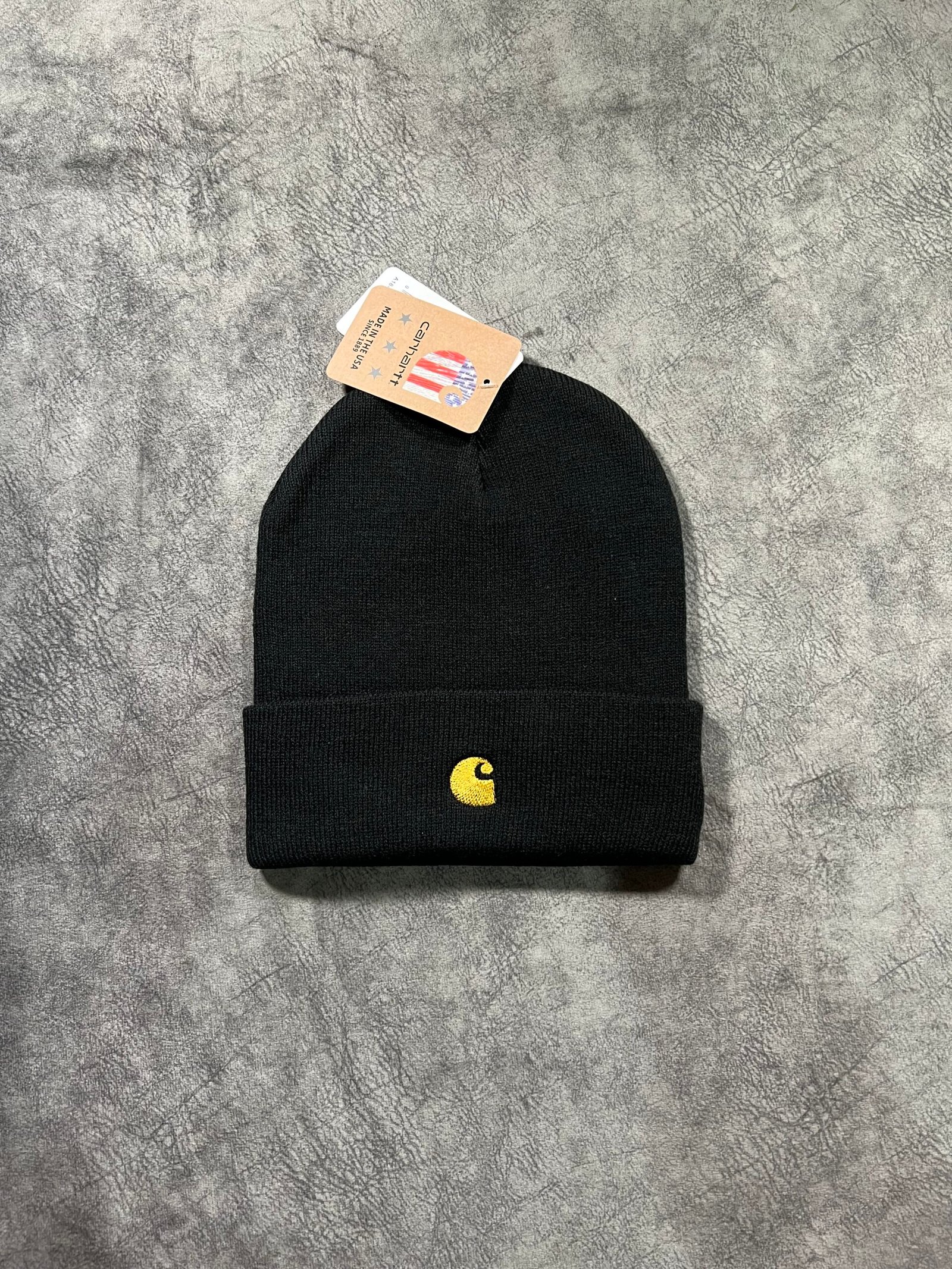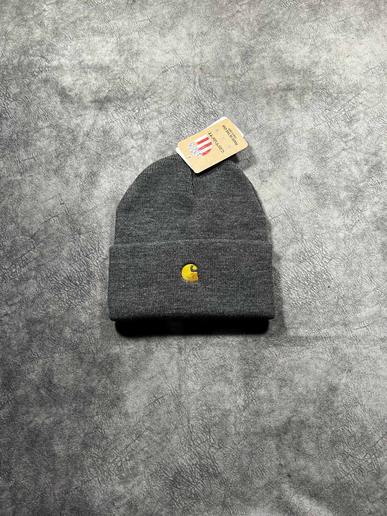 Gorro de punto clásico confeccionado en tejido acrílico suave y elástico. Presenta diseño de canalé y el icónico logo de Carhartt bordado en el dobladillo.